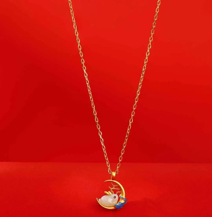 这款项链将月亮、玉兔、祥云、月桂枝相结合,不仅还原古代神话故事,而且寓意着幸福美满,为家人祈福健康圆满,在这个重视健康的年代佩戴它非常合适。