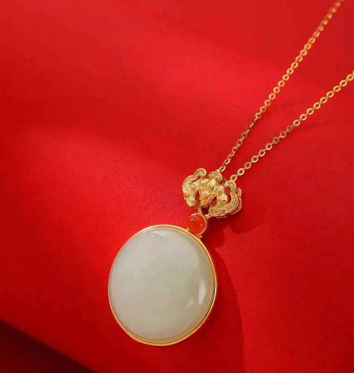玉盘和细项链形成强烈的反差,佩戴时显得脖子纤细欣长,极其优雅。