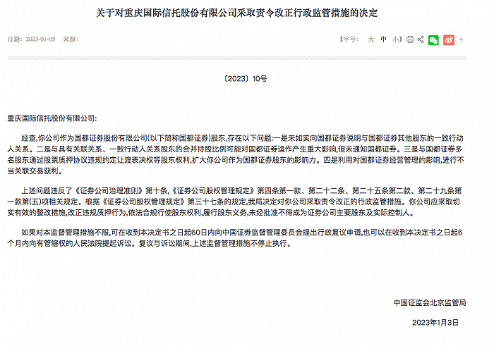 北京证监局称,上述问题违反了《证券公司治理准则》第十条,《证券公司股权管理规定》第四条第一款、第二十二条、第二十五条第二款、第二十九条第一款第(五)项相关规定。根据《证券公司股权管理规定》第三十七条的规定,决定对重庆国际信托采取责令改正的行政监管措施。