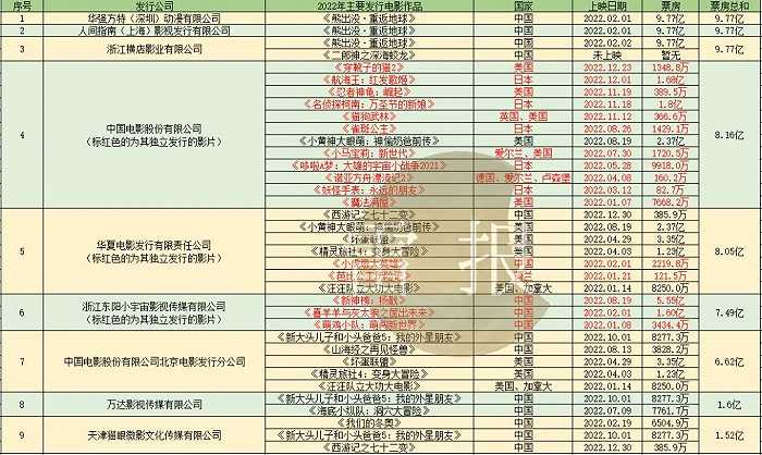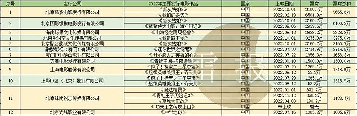 中国电影股份有限公司北京电影发行分公司(下文简称“中影北京分公司”)在2022年共发行了5部动画电影,在数量上位列第三,在票房上位列第七。