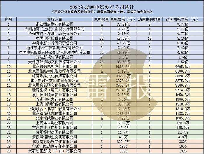 在2022年上映的46部动画电影中,涉及28家主要发行公司(本文不涉及参与联合发行的公司)。其中,《超级特战队》由华夏电影发行有限公司(下文简称“华夏电影“)联合发行,《龙马!新生网球王子》的发行时间为2021年,故上述电影不在本文的讨论范围。