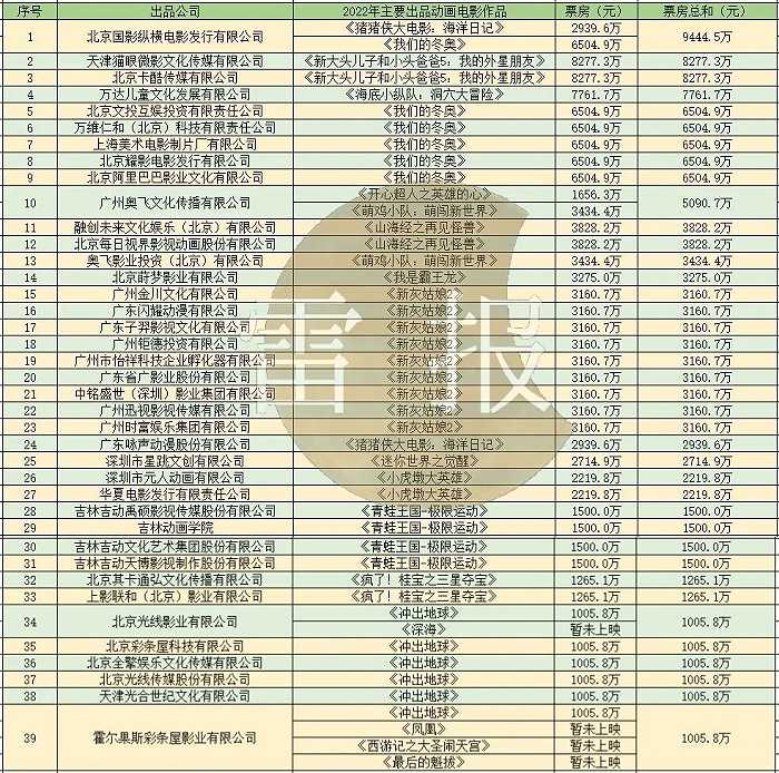 在2022年出品公司出品的动画电影总票房排行榜位居千万元行列的39家公司中,北京国影纵横通过参与《猪猪侠大电影:海洋日记》和《我们的冬奥》的出品,最终获得了9444.5万元的票房总成绩。