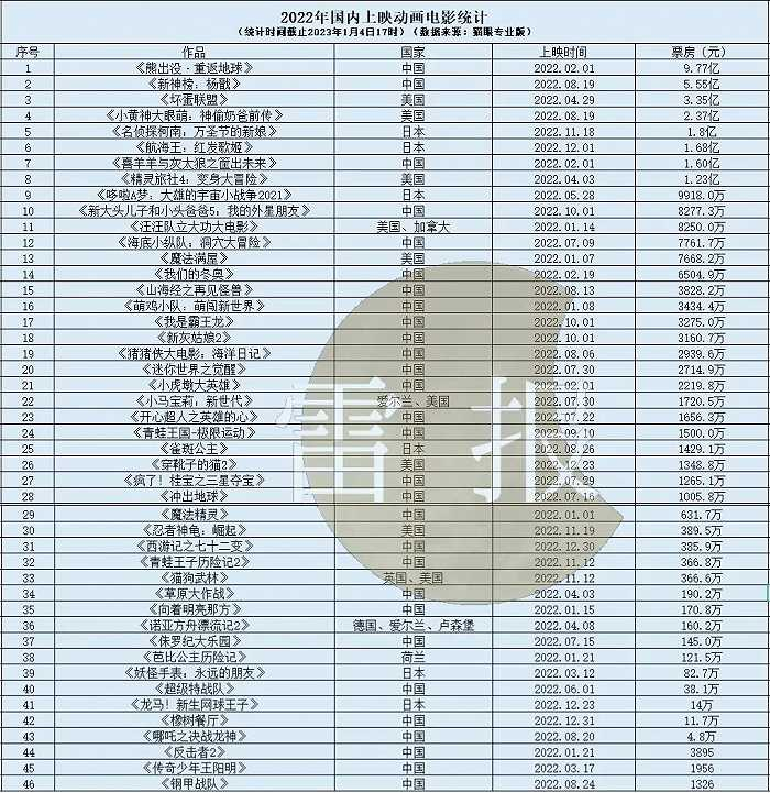 动画电影2022:46部动画电影上映,票房最高9.77亿,最低1326元