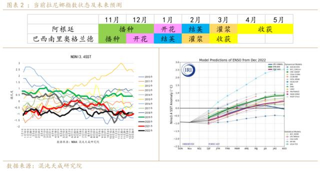 当前我们仍然处于强拉尼娜的状态,并且大概率持续到明年1-2月,这是南美大豆关键生长季。阿根廷大豆的关键生长季是1-3月份,巴西南部主产区的关键生长季是12-2月份。从拉尼娜指数预测上来看,今年拉尼娜指数比较像去年,因此有理由相信今年南美大豆仍会减产。