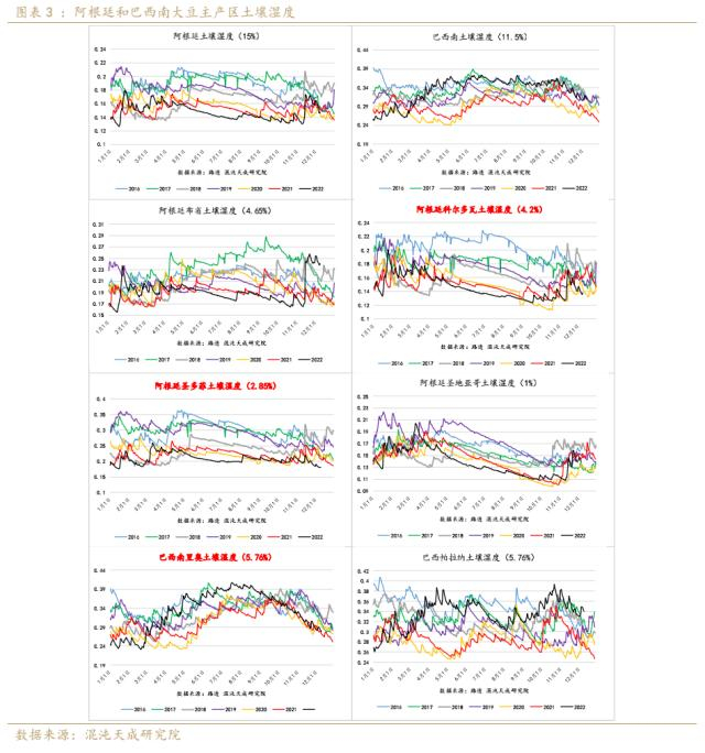 根据历史经验,如果1-3月份阿根廷大豆主产区的土壤湿度维持在0.18以下,阿根廷大豆必减产,偏离0.18越远持续时间越长,减产越严重,比如2018年阿根廷大豆减产30%。如果巴西南土壤湿度维持在0.29以下,巴西南部大豆就会减产,2019/2020年巴西南减产10%,而去年减产45%。目前南美大豆主产区土壤湿度如下: