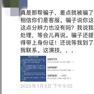 2022年12月30日,余姚市民沈某报案称,其接到(19****6723)开头的陌生来电,对方自称京东客服,要求其注销京东白条账户,否则会影响个人征信。事主沈某信以为真,按照对方要求下载云视讯聊天软件,后对方通过视频聊天骗沈某进行转账汇款等操作,共计被骗54万余元。
