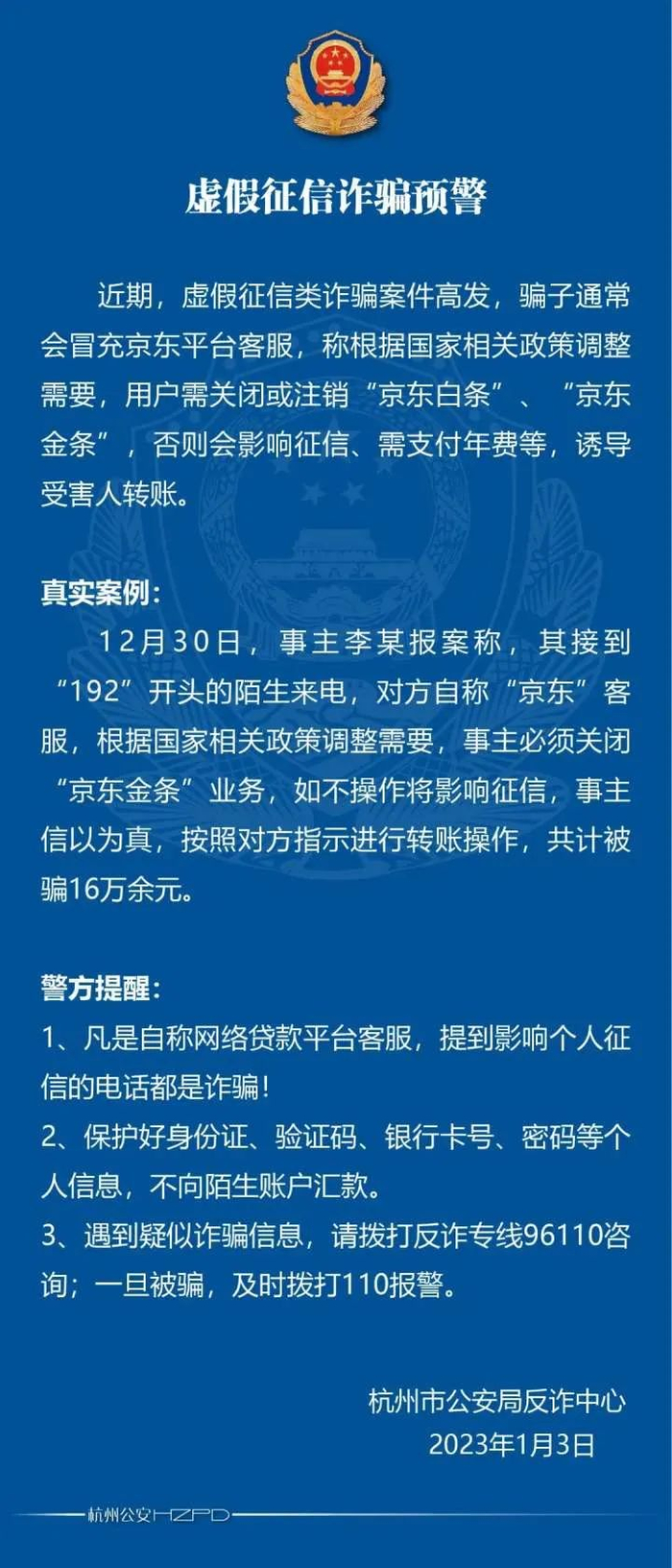 杭州警方接到事主李某报案称,他接到“192”开头的陌生来电,对方自称“京东”客服,根据国家相关政策调整需要,事主必须关闭“京东金条”业务,如不操作将影响征信,事主信以为真,按照对方指示进行转账操作,共计被骗16万余元。