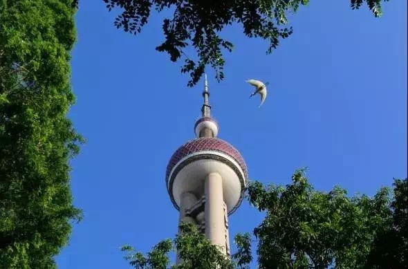 靠近滨江的一片绿地里,往上拍经常能捕捉到飞鸟与明珠的和谐画面。