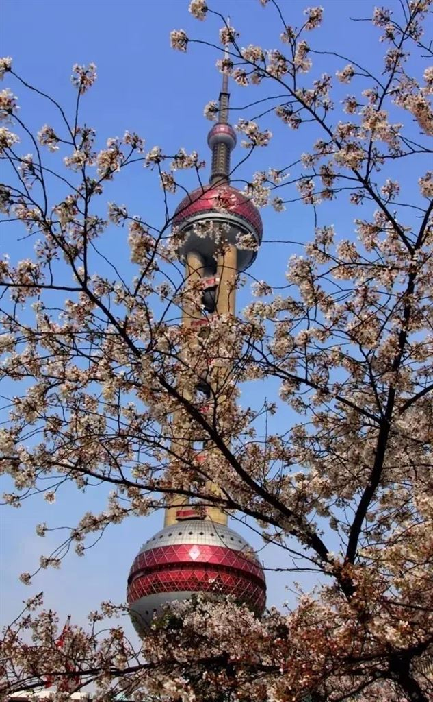 带点花更美,开春记得去拍,东方明珠附近的樱花可不少呢!