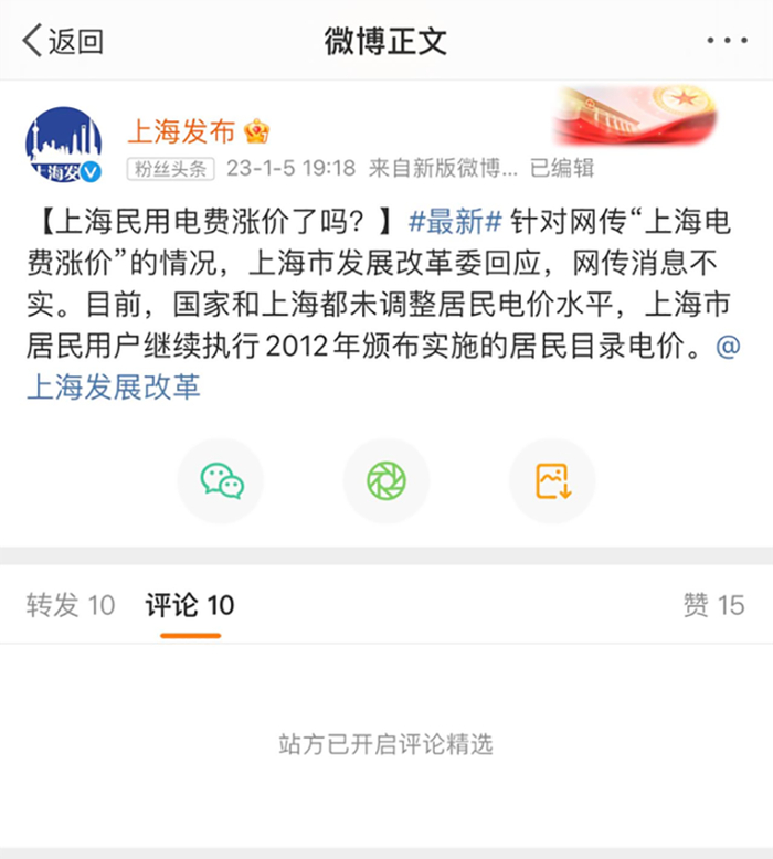 上海市政府新闻办公室官方微博“上海发布”也于1月5日晚对于电价上涨传言进行辟谣。