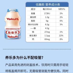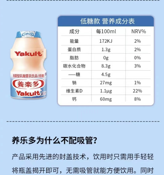 从营养表看,养乐多蛋白质含量低,且碳水含量高。每100ml中蛋白质仅为1.3g,牛奶中一般为3.0g,共使用“白砂糖”和“食用葡萄糖”两种糖,每100ml中含有的碳水,甚至比可乐还多。