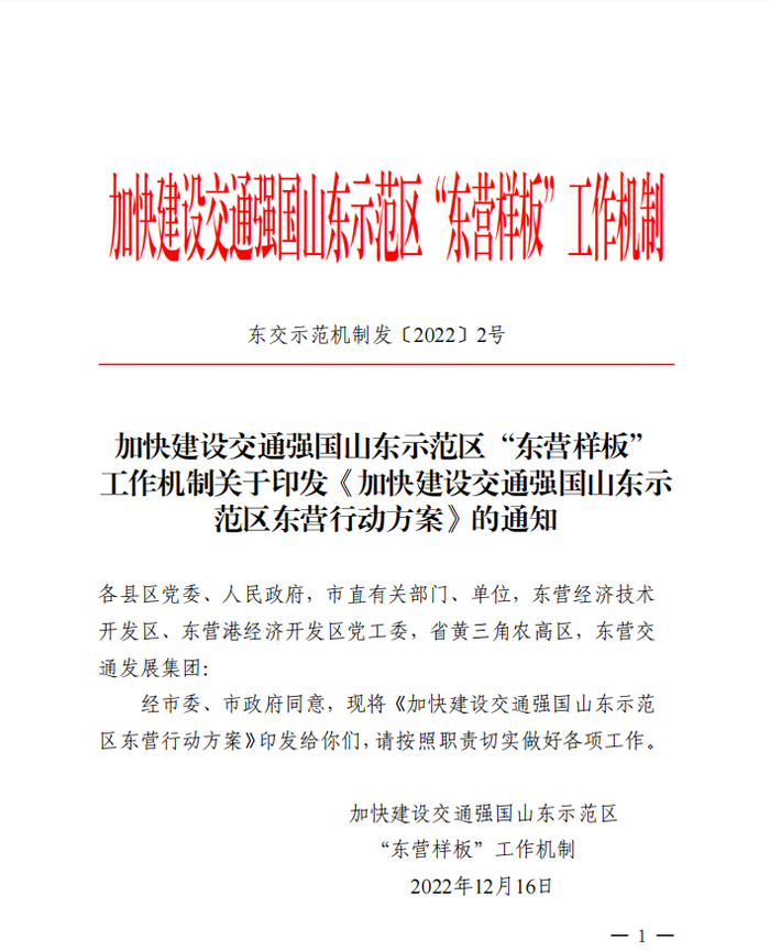 2022年12月16日,经市委常委会、市政府常务会审议同意,《加快建设交通强国山东示范区东营行动方案》正式印发实施,为今后推动东营交通运输事业大发展、大跨越、大提升提供了根本遵循和科学指引。方案指出,利用三年时间,聚力实施加快补齐铁路建设运营短板、加快建成东营港亿吨深水大港、加快建设现代公路网、高质量发展航空运输及航空产业等9大行动,重点推进“15个样板试点、44个重点项目、13项重点工作”,力争到2025年,交通强国山东示范区“东营样板”创建取得重大突破,主要指标实现较大跃升,高铁、海铁联运、公水铁联运等实现“零的突破”,绿色交通、智慧交通、平安交通、信用交通建设走在全省前列。