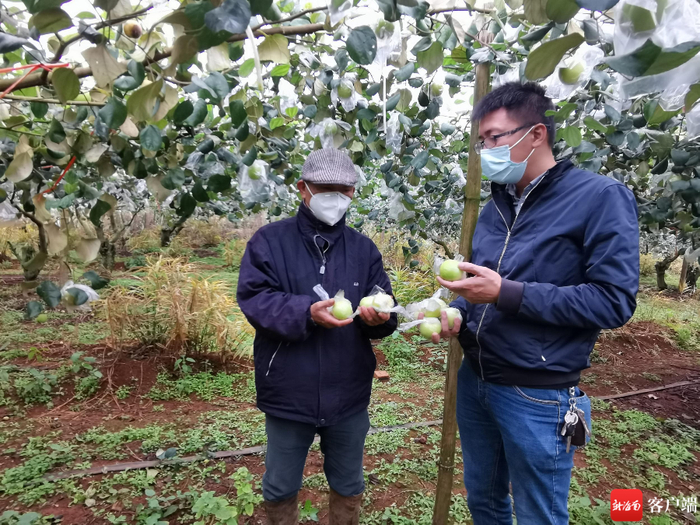 陈玉夏(右)与农户陈少铭在讨论种植苹果枣。