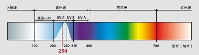 根据紫外辐射对生物作用的生物效应,将紫外光谱分为多个区域:CIE定义UV-A是波长范围在315nm~400 nm之间的辐射,UV-B是波长范围在280nm~315 nm之间的辐射,UV-C的波长范围为100nm~280 nm。紫外光谱中UV-C部分的能量最高,杀菌消毒最有效,最常使用UV-C来杀菌消毒,因此UV-C又被称为短波灭菌紫外线。