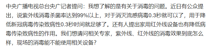 2022年11月29日下午,国务院联防联控机制召开新闻发布会,主题为“落细落实防控措施,有效抓好疫情处置”。发布会期间,有一位记者问了一个关于紫外线和红外线消毒的问题。