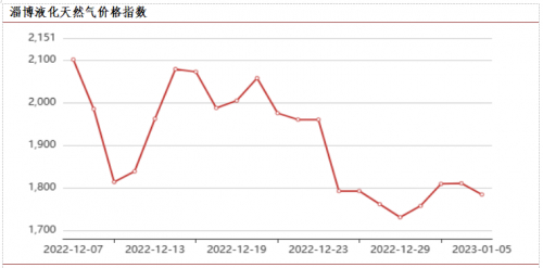 元旦期间外围资源流入困难,运输成本增加带动市场价格上涨。周后期区内供应恢复,但由于淄博地区空气质量进入二级应急相应,区内车用需求和工业需求产生回落。本周液化天然气价格指数先涨后跌,管道天然气指数暂未调整。