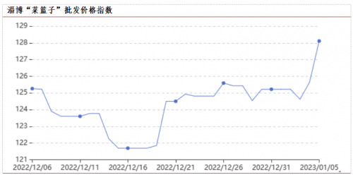 2023年1月5日,淄博“菜篮子”批发均价指数128.11,环比上周上涨3.57,涨幅2.87%;淄博“菜篮子”零售价格指数131.65,环比上周上涨2.33,涨幅1.80%。从目前淄博市监测的八大类农产品来看,批发及零售指数均呈上涨趋势。指数波动较多的品类为蔬菜。从变动情况来看: