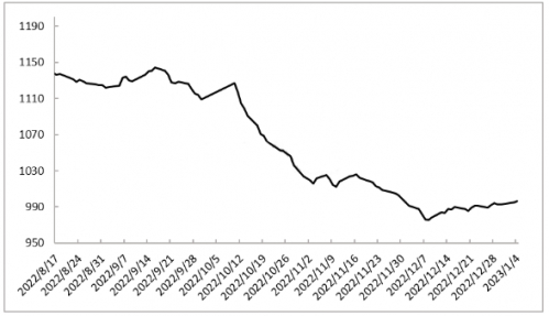 截止至2023年01月05日,“菜篮子”零售价格指数131.65,环比上周四上涨1.80%。