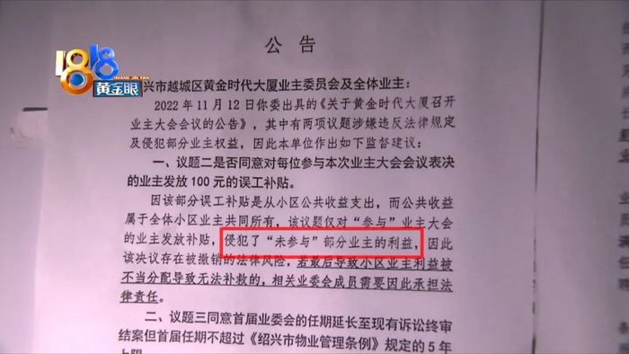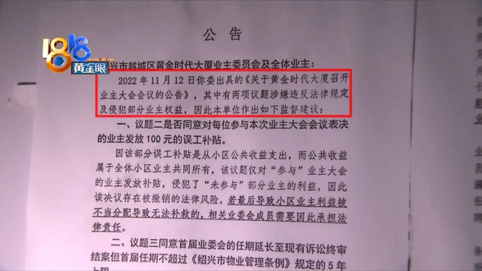 另一份是属地街道办事处发的,说小区业委会之前的一份召开业主大会的公告,有两项议题涉嫌违法,而且侵犯了部分业主利益。
