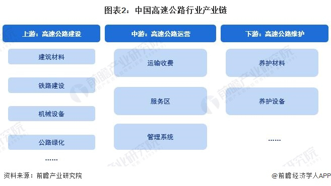 中国高速公路产业包括公路建设、公路运营、公路维护三大环节。公路建设主要包括线路建设、建筑材料、机械设备、公路绿化;公路运营包括运输收费、服务区、管理系统;公路维护包括养护设备、养护材料,中国高速公路公司多基于公路建设纵向布局,产业链跨度广。