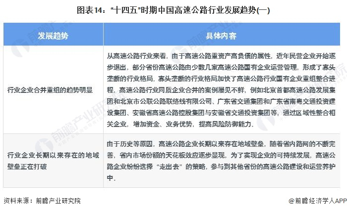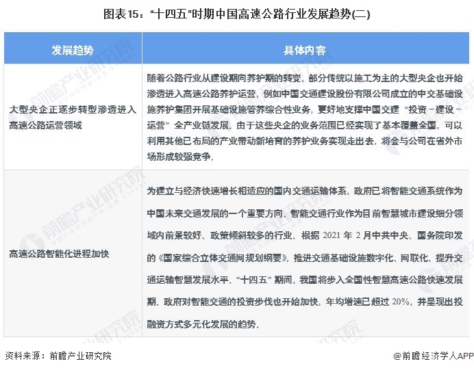 “十三五”时期,我国综合交通运输体系建设取得了历史性成就,高速公路对20万人口以上城市覆盖率超过98%,高速公路省界收费站全面取消,交通物流降本增效成效显著。“十四五”时期,我国高速公路行业将呈现出行业企业合并重组的趋势明显、行业企业打破地域壁垒、大型央企转型渗透高速公路运营领域和高速公路智能化进程加快等发展趋势: