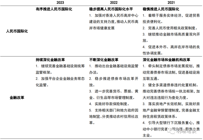 2023年央行工作会议延续“精准有力”表述,虽然淡化“量”的稳定,但更强调“价”的降低。首次提到加大金融支持“国内需求和供给体系”力度,房地产表述从“防范金融风险”部分转移至“金融支持实体部分”, 宽信用、扩内需、稳地产的目标明确。