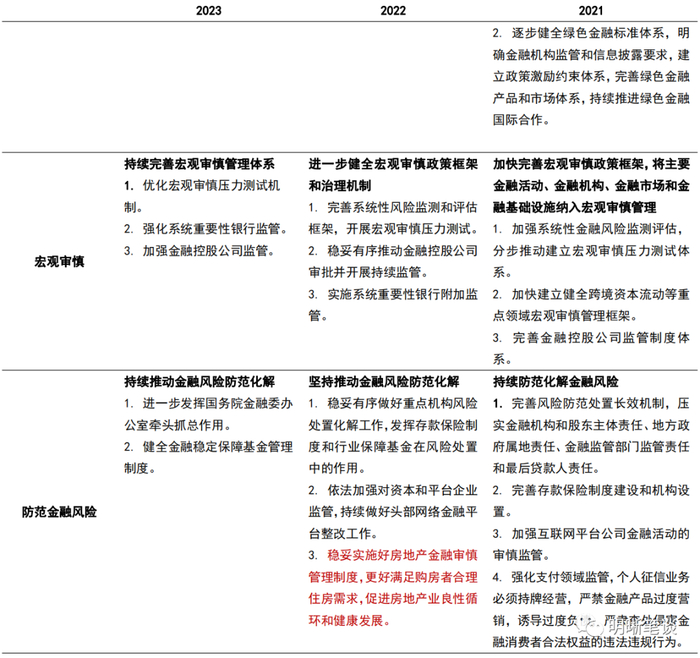 房地产表述从“防范金融风险”部分转移至“金融支持实体部分”,政策暖意明确。2022年会议中房地产市场相关表述出现在“防范金融风险”的部分,优先强调实施好地产行业的金融审慎管理制度。今年会议中地产相关表述出现在金融支持实体经济的部分,除去“支持房地产市场平稳健康发展”的表述外,会议强调要落实前期部署的金融16条地产支持措施。尽管本次会议对地产支持的表述相对简洁,但表述位置的调整体现出央行支持地产行业的态度明确,结合四季度货币政策例会中“保交楼也要保主体”的相关表述,预计今年宽地产政策空间较为充足。会议次日,央行和银保监会建立了首套住房贷款利率政策动态调整机制,下调和取消了部分符合特定要求城市的房贷利率下限,进一步印证了今年宽地产政策发力的预期。