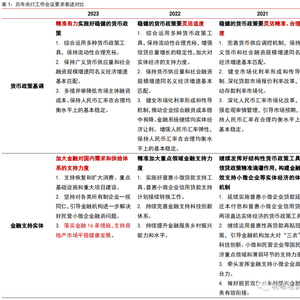 货币政策基调延续稳健,但“精准有力”代替“灵活适度”。本次会议延续了实施“稳健”货币政策的总述,但相较于去年“灵活适度”的表态,今年会议对货币政策定调“精准有力”。在此前召开的中央政治局会议、中央经济工作会议以及四季度央行货币政策例会上已多次提及“精准有力”。我们认为,“灵活”转向“精准”,意味着基于2022年国内疫情多发散发导致的经济整体修复缓慢,灵活采取各类货币政策工具稳住宏观经济大盘,会转变为更加注重于解决经济在疫后修复中的结构性问题,推动经济运行整体好转;“适度”转向“有力”,意味着当下货币政策支持稳增长、稳就业、稳物价目标较为明确,将加大力度支持扩内需和宽信用。总体而言,预计2023年货币政策将更加注重疫后经济修复阶段面临的问题,结构性货币政策工具配合信贷、产业政策等进行精准支持。