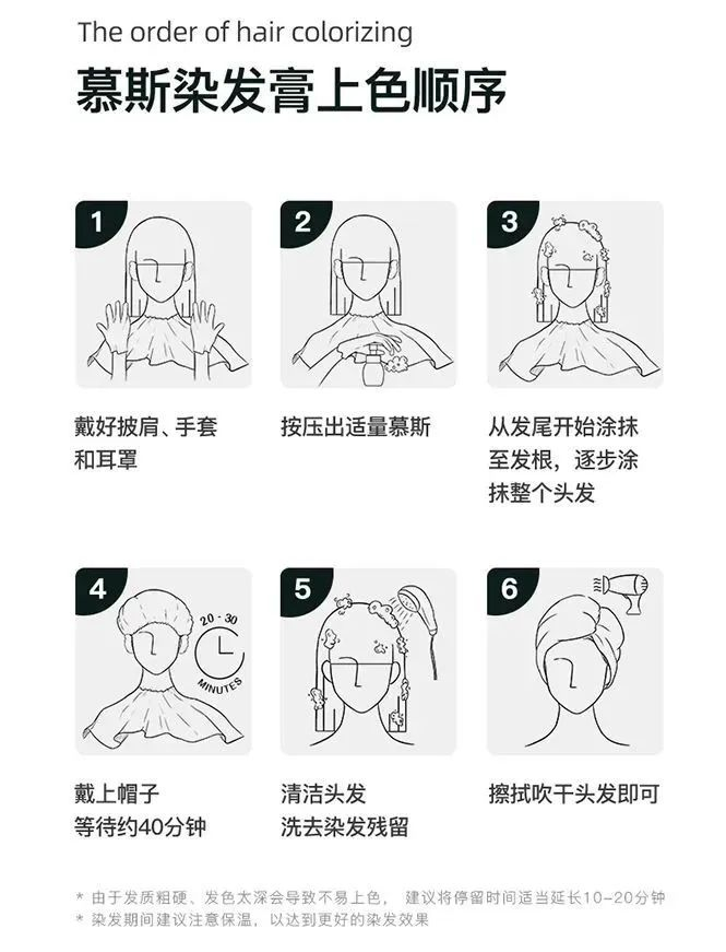 ,留色时间长达3个月。ps:细软发质建议20-30分钟,粗硬发质,可适当延长10-20分钟。