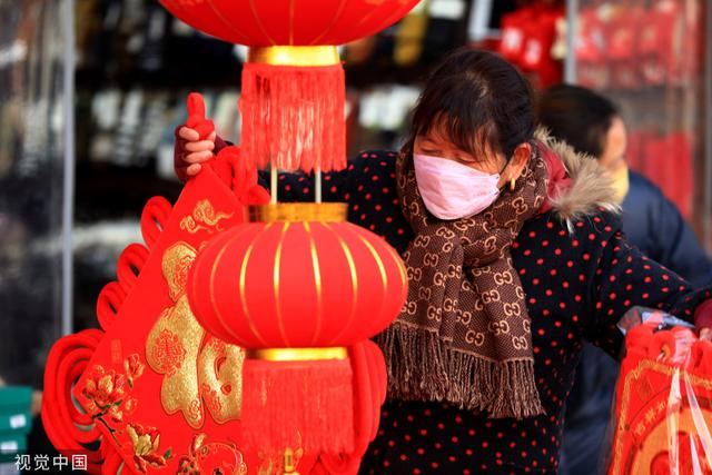 1月7日,江苏省淮安市汇通小商品市场内,市民选购各类新年饰品。春节临近,淮安市汇通小商品市场进入节日饰品的购销旺季,红双喜、福字、红灯笼、春联、中国节、兔年生肖饰品等受到顾客青睐。图片来源:周长国/视觉中国