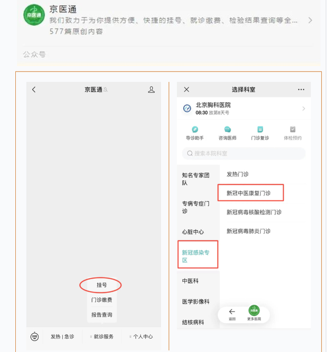就诊须知:您可以通过京医通微信公众号、北京114预约挂号平台和医院京医通自助机进行预约挂号,可关注京医通微信公众号,点击“就诊服务”-“挂号”,选择“北京胸科医院”-“新冠感染专区”-“新冠中医康复门诊”。