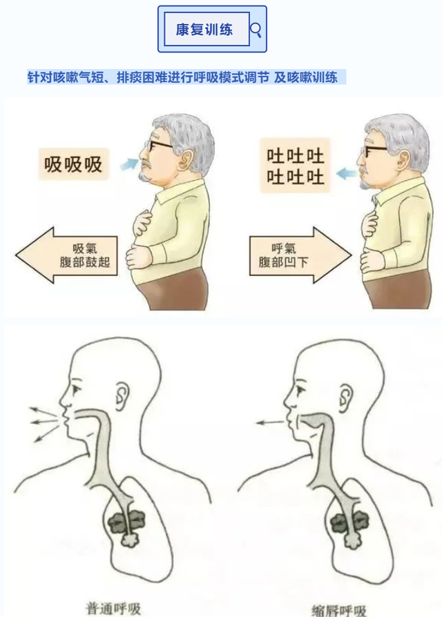 答:当患者出现呼吸频率加快或胸腹矛盾呼吸时,可通过腹式呼吸调整呼吸节奏,从而减少呼吸做功,提高呼吸效率:可采用鼻吸口呼的方式,呼气时应用缩唇呼气,此过程中可将手放在腹部,吸气时感受腹部向上隆起,呼气时放松呼出,腹部自然收回;还可以进行胸廓活动度训练、调动呼吸肌群参与;使用呼吸训练器进行吸气肌训练等。
