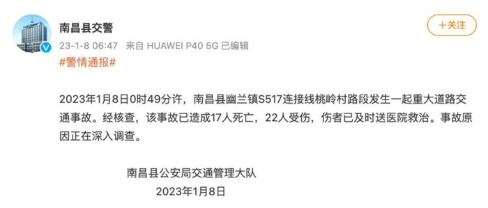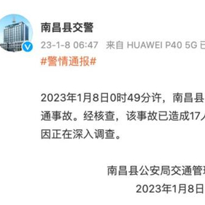 据江西省南昌县公安局交通管理大队官方微博@南昌县交警 消息:2023年1月8日0时49分许,南昌县幽兰镇S517连接线桃岭村路段发生一起重大道路交通事故。经核查,该事故已造成17人死亡,22人受伤,伤者已及时送医院救治。事故原因正在深入调查。