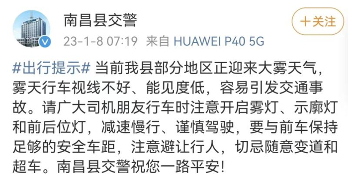 南昌县交警提醒,当前南昌县部分地区正迎来大雾天气,雾天行车视线不好、能见度低,容易引发交通事故。请广大司机朋友行车时注意开启雾灯、示廓灯和前后位灯,减速慢行、谨慎驾驶,要与前车保持足够的安全车距,注意避让行人,切忌随意变道和超车。