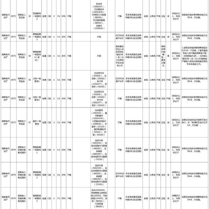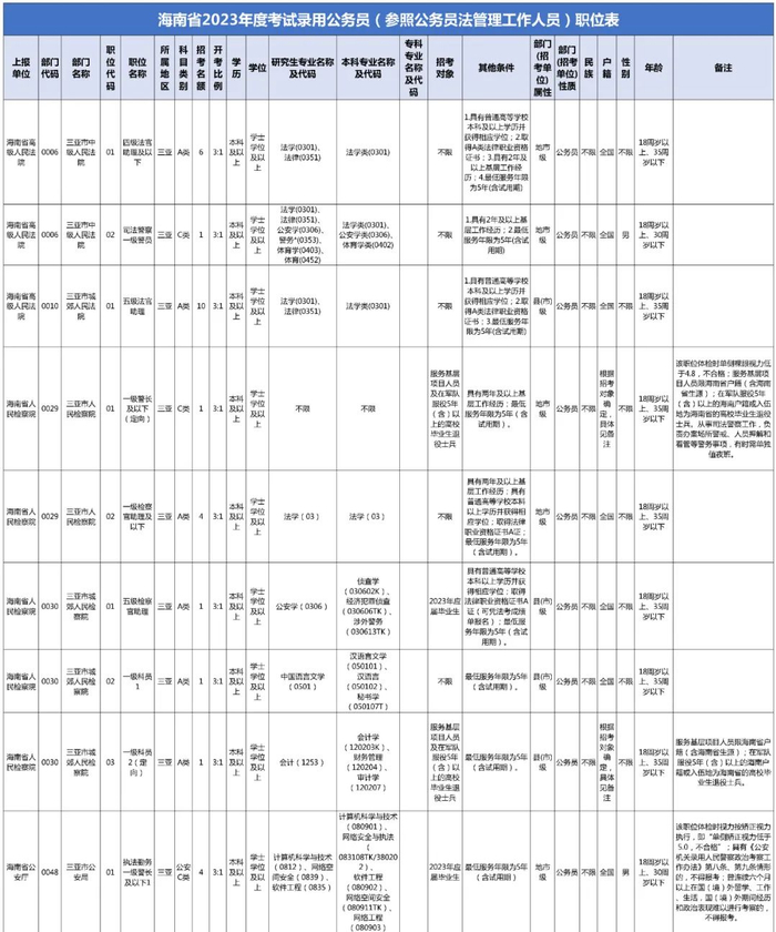 具体的招考职位、招考名额、考试类别、报考资格条件以及专业目录等详见《海南省2023年度考试录用公务员(参照公务员法管理工作人员)职位表》《海南省2023年度考试录用公务员(参照公务员法管理工作人员)专业参考目录》(见附件2、附件3)。请登录南海先锋网站(https://www.nanhaixf.gov.cn)或海南省考试局网站(http://ea.hainan.gov.cn),进入海南省考试录用公务员网上报名系统(以下简称“网上报名系统”)查阅。