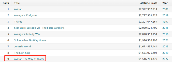 15亿美元的票房成绩也让《阿凡达2》超过《壮志凌云2》,成为2022年上映电影的票房冠军,并跻身影史前9。