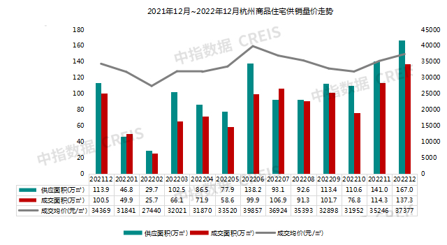年末楼市“翘尾”,供应、成交量再创新高。2022年12月,杭州十区(包含临安、富阳)的商品住宅供应164万方,环比增长18.5%,成交137.3万方,环比增长20.1%。受到11月贷款政策放宽、年末推盘节奏加快、改善项目集中入市的影响,供应面积和成交面积再创新高,成交均价突破37000元/平方米。