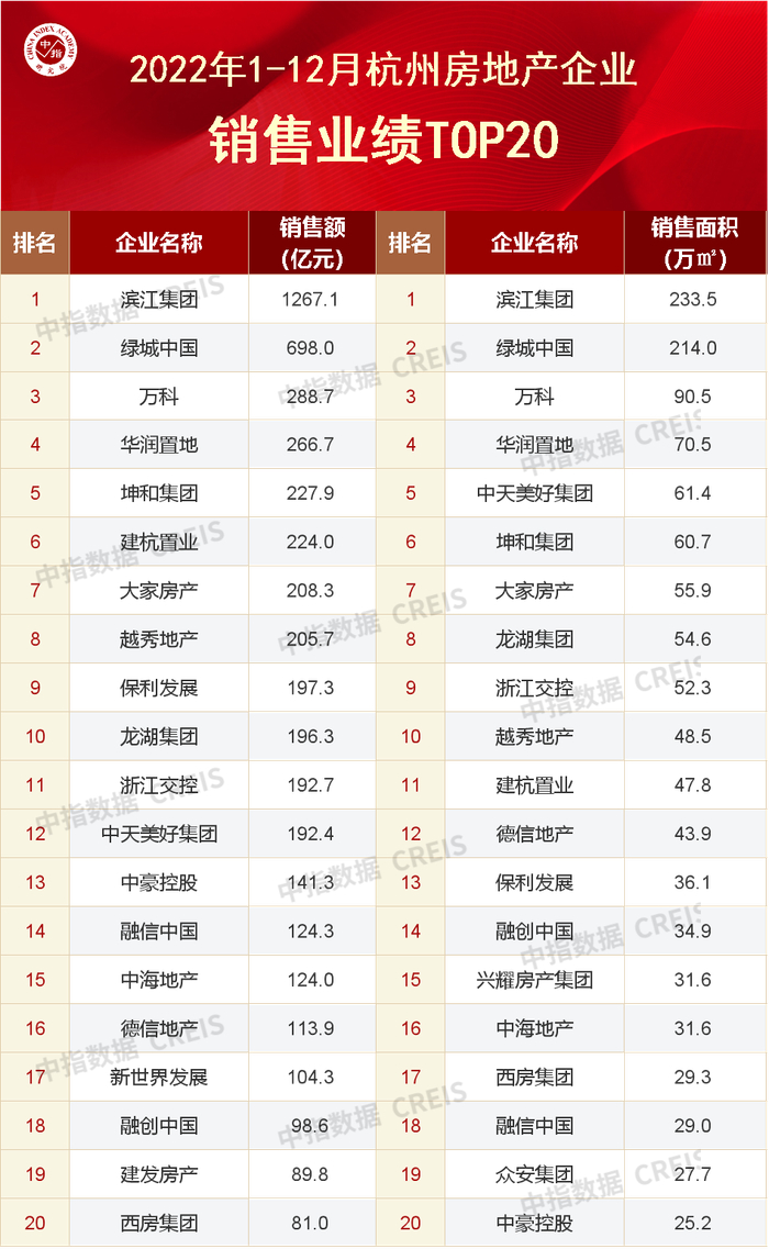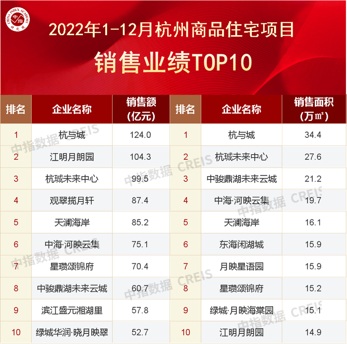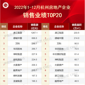 特别声明:杭州房地产企业销售数据统计是以2022年1月1日-12月31日期间销售的全口径商品房为统计口径,主要依据中指数据CREIS(点击查看)在杭州的销售监测数据,并参考当期总体经营情况和推盘去化情况进行分析统计;对于少数没有在监测范围内的项目,由企业提供相关证明文件,经课题组对数据进行严格审核,也纳入统计范围。本报告仅供参考,课题组不对使用报告及其内容所引发的任何直接或间接损失承担责任。