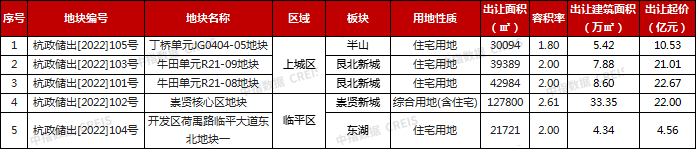12月27日,杭州市国有建设用地使用权挂牌出让公告发布(2022年第五批集中供地),本次共推出5宗涉宅地块,土地面积约26.2万方,总规划建筑面积59.6万方,总起拍价80.8亿元。5宗地块分别位于上城区和临平区,其中上城区艮北2宗、丁兰1宗,临平区东湖新城1宗、崇贤1宗,计划将于2023年2月7日出让。