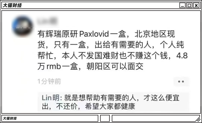 1.2万一盒也不算多,还有更狠的,还有人遇到朋友圈卖药,号称“不发国难财纯帮忙”,一盒4.8万,10多倍的溢价还属于“便宜出,不还价”,这要是学会发国难财那一套,还不得卖10万啊。