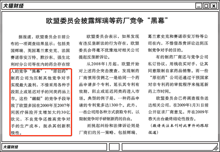 辉瑞的这一套,欧盟看的就很明白,为了盈利,压制竞争对手同类药品,已经是老把戏了,这些手段让欧盟在2000-2007年增加了30亿欧元的开支。