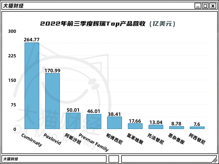 2022年的前三季度,Comirnaty占比降低到了35%,而补位的就是Paxlovid,170.09亿美元的收入,占到总营收的22%,两款单品就占到全部营收的57%。