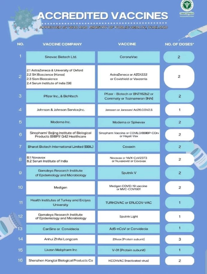 注:科兴灭活疫苗、国药灭活疫苗、深圳康泰灭活疫苗、康希诺腺病毒载体疫苗及智飞生物重组蛋白疫苗都已得到泰国卫生部承认(如图2所示),完整接种以上疫苗的旅客皆可入境。