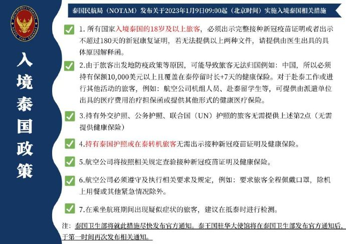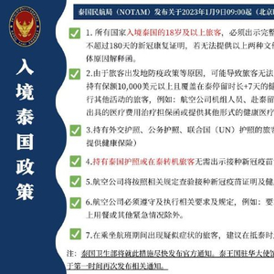 @泰国国家旅游局 微博消息,2023年1月9日09:00起,入境泰国的国际旅客仍然不隔离、不检测,但需出示完整新冠疫苗接种证明和保额不少于1万美元的健康保险,具体要求如图1所示。