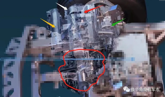 左侧图为1.5Ti机型正向特写,红色区域为双电机+双电控系统(EHS)本体,黄色区域为发动机本体,进气歧管(黄色箭头)、可变流量电子水泵(蓝色箭头)集成在缸体、取消了机械水泵、液压转向机助力泵等轮系和皮带(白色箭头)。