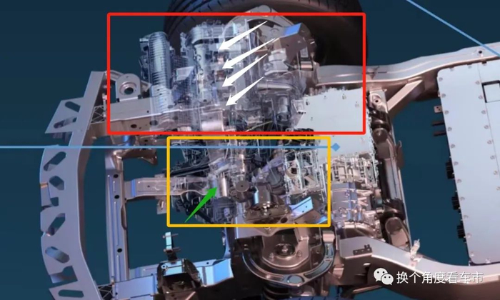 右侧图为EHS(双电机+双电控系统)本体侧向特写,可见双电机部分的发电机(黄色箭头)和驱动电机(红色箭头),双电控系统(绿色箭头)。