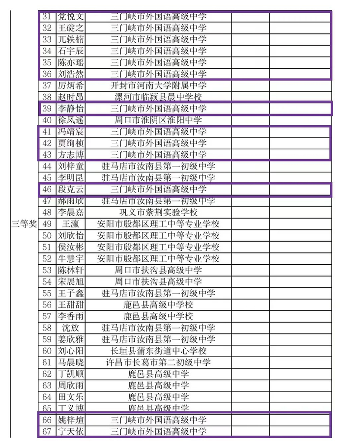 云上对决显身手,诗词大赛创佳绩。近日,河南省教育厅公布了“2022年河南省诗词大赛获奖名单”,三门峡市外国语高级中学44名同学在本次诗词大赛中取得优异成绩。其中,袁萌萌等4名同学获得中学组一等奖;郝静雯等11名同学获得中学组二等奖;马源君等29名同学获得中学组三等奖。王亚革老师、辛景利老师获“优秀辅导教师”奖。