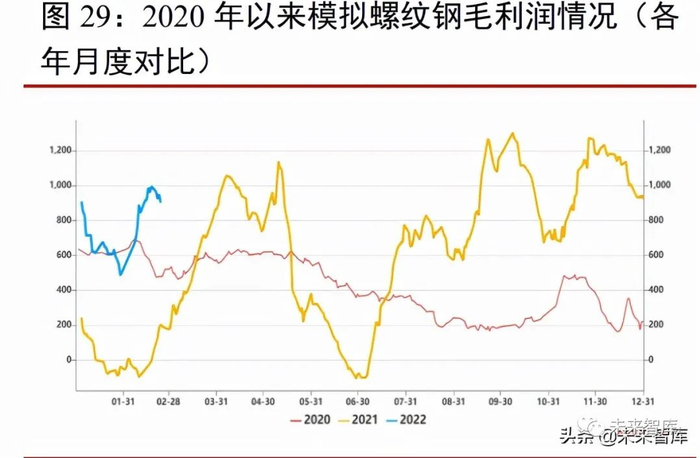 2021 年,我国钢材价格波动较大,5 月和 10 月的回调导致钢材盈利明显下降。近 期,随着铁矿石价格受监管而下跌,钢材盈利有所好转。我们认为,2022 年钢铁产量或 与 2021 年持平,对铁矿石和焦炭需求拉动作用较弱,二者价格或维持相对稳定。而钢铁 国内需求或低速增长,对全年钢价形成支撑,使得钢企盈利向好。节奏方面,随着采暖 季错峰生产的结束,基建等用钢需求有望逐步释放,我们认为三、四月份钢价或走高, 而原材料价格涨幅或小于钢价涨幅,钢企盈利有望继续向好。