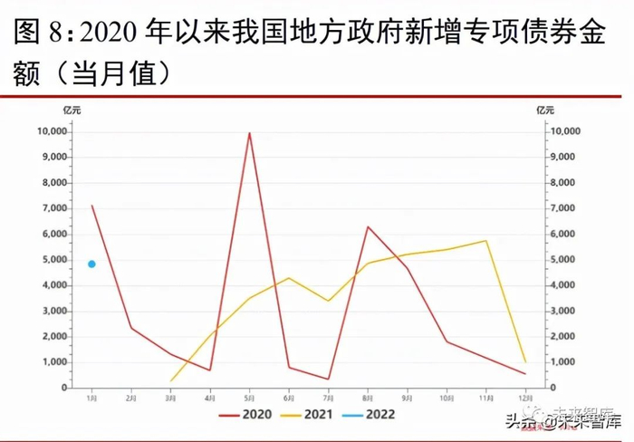 2021Q4,我国各地方共发行新增专项债券 1.22 亿元,在新增专项债集中发行的情 况下,我国基础设施投资累计同比增速在 12 月转正。2022 年 1 月,我国共发行新增专 项债券 4844 亿元,投向基建的占比超过 70%。