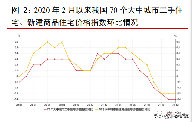 此外,2021 年初,深圳率先建立二手住房成交参考价格发布机制,随后无锡、东莞、 宁波、成都等城市跟进。二手房指导价出台后,我国 70 个大中城市新建商品住宅和二手 住宅价格指数环比增速均呈下跌趋势,且从 2021 年 9 月开始两个价格指数持续环比负 增长。同时,2021 年我国商品房销售面积、销售额、房地产开发投资完成额的同比增速均持续走低。而房地产开发资金来源中的国内贷款累计同比增速自 2021 年 6 月份进入 负区间。此外,房屋新开工面积累计同比于 2021 年 7 月份进入负增长区间,且累计同 比降幅持续扩大,全年房屋新开工面积同比下降幅度达到 11.4%。施工面积方面,2021 年下半年以来累计同比增速持续下滑,全年房屋施工面积同比增长 5.2%。